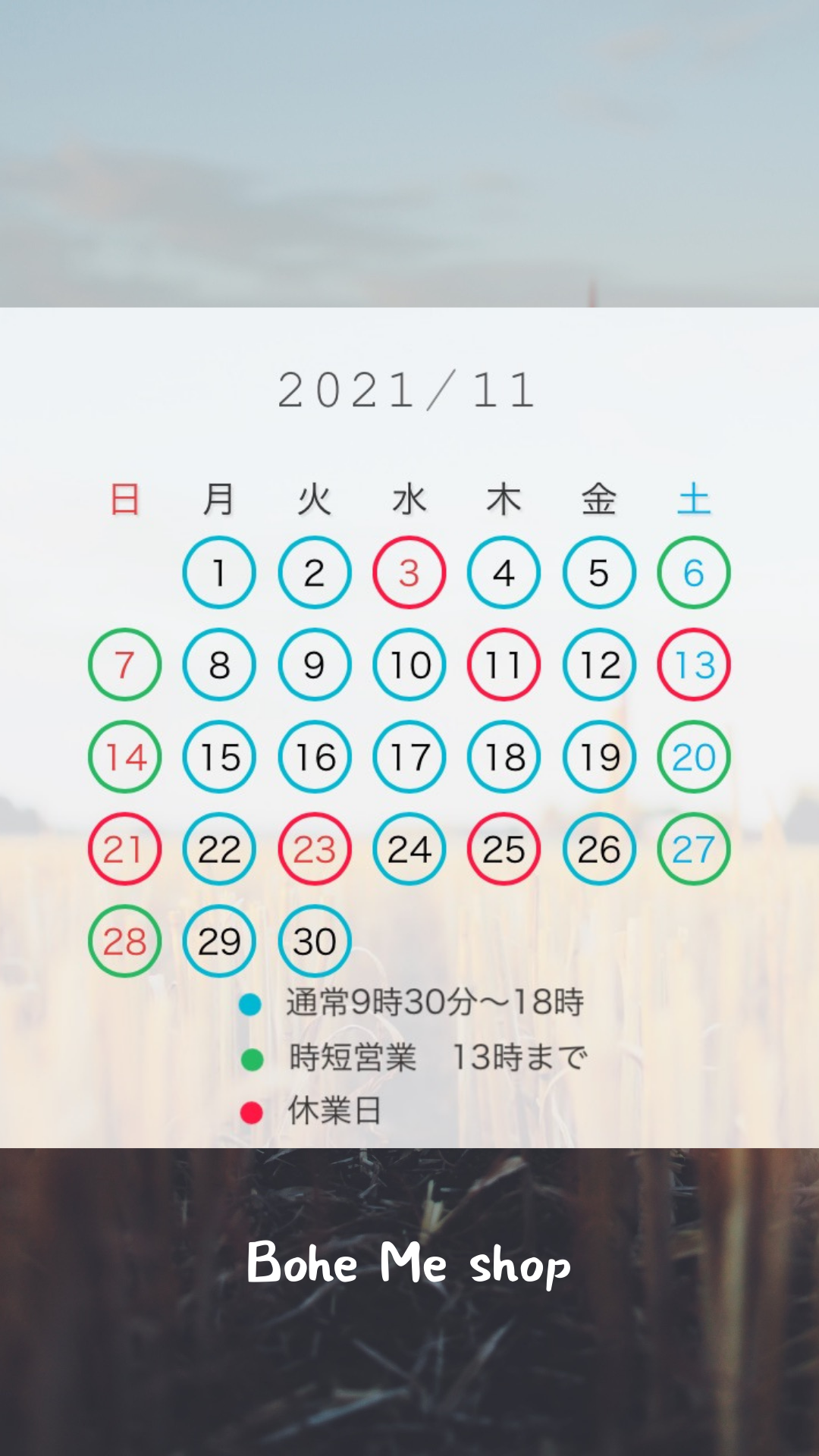 11月営業日【Bohe Me shop】