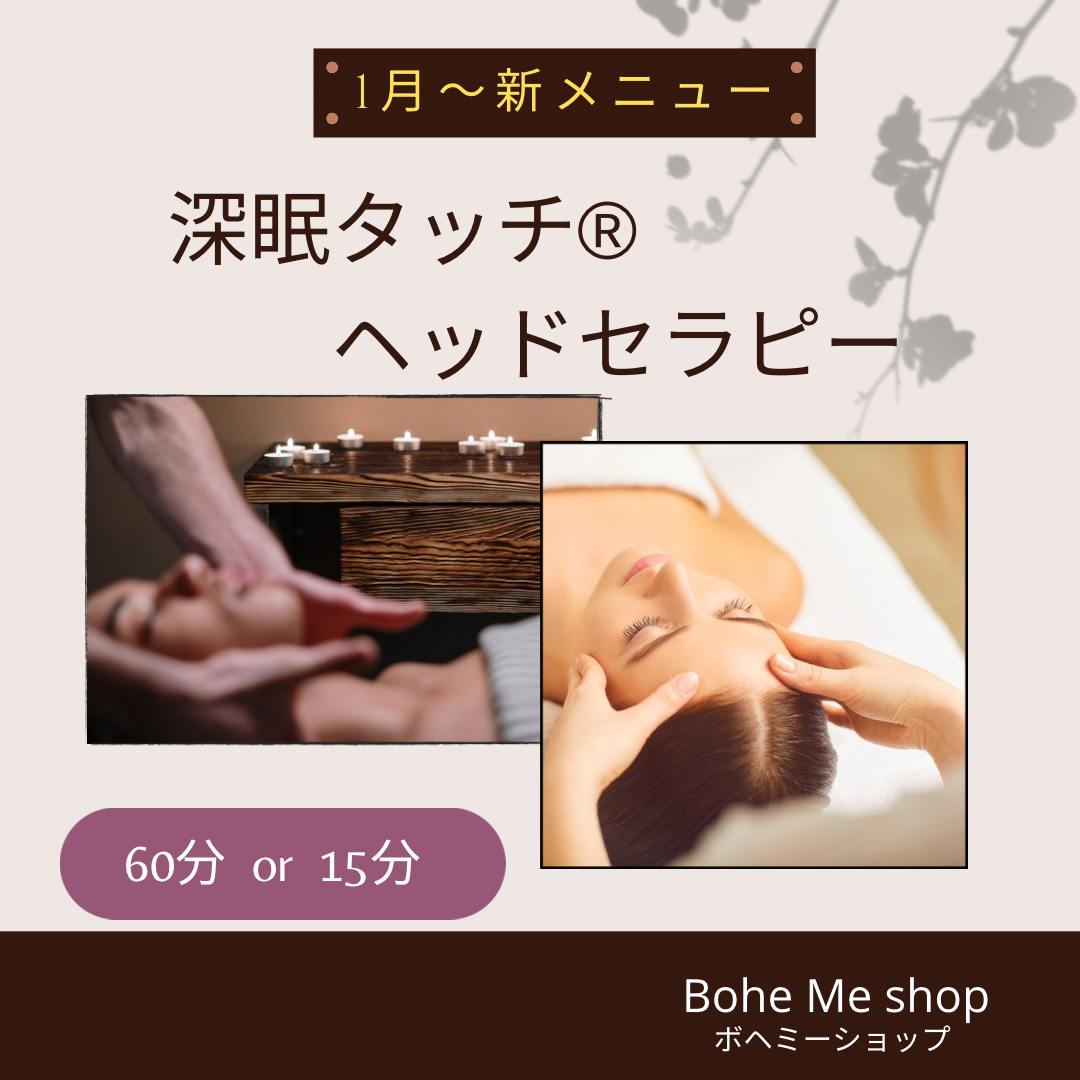 1月から新メニュー追加決定!!【Bohe Me shop】 2021/12/15 足踏み全身揉みほぐし 足踏みによる全身の揉みほぐし!! 今までに体感した事ないぐらいの心地よいタッチで、 毎日の疲れが溜まったお身体を丁寧に解して行きます。 この深感覚にやみつき間違いなし!!^_^ 是非是非、体験してみて下さい★ 深眠タッチ®︎ヘッドセラピー ヘッドスパでもヘッドマッサージでも体感できない感覚を、 皆様にお届けしたいと思いメニュー追加しました^_^ なかなか夜が寝付けない方オススメです!! 体感した人しか、分からないこの感覚★是非体感して下さい♪ お知らせ♫