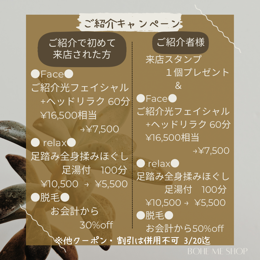 期間限定キャンペーン【Bohe Me shop】 2023/02/01 ハーブトリートメント 期間限定キャンペーン 初めてのハーブトリートメントキャンペーン 通常2gでメニューにありますが、 初めての方でも安心してご利用いただけます✨ この機会にぜひお試し下さい🌿 ⬇︎⬇︎⬇︎ ご紹介キャンペーンも始まります! ご紹介限定メニューになりますので、乞うご期待下さい😊 沢山のご紹介お待ちしております✨ ★おすすめのメニュー★ お知らせ♫