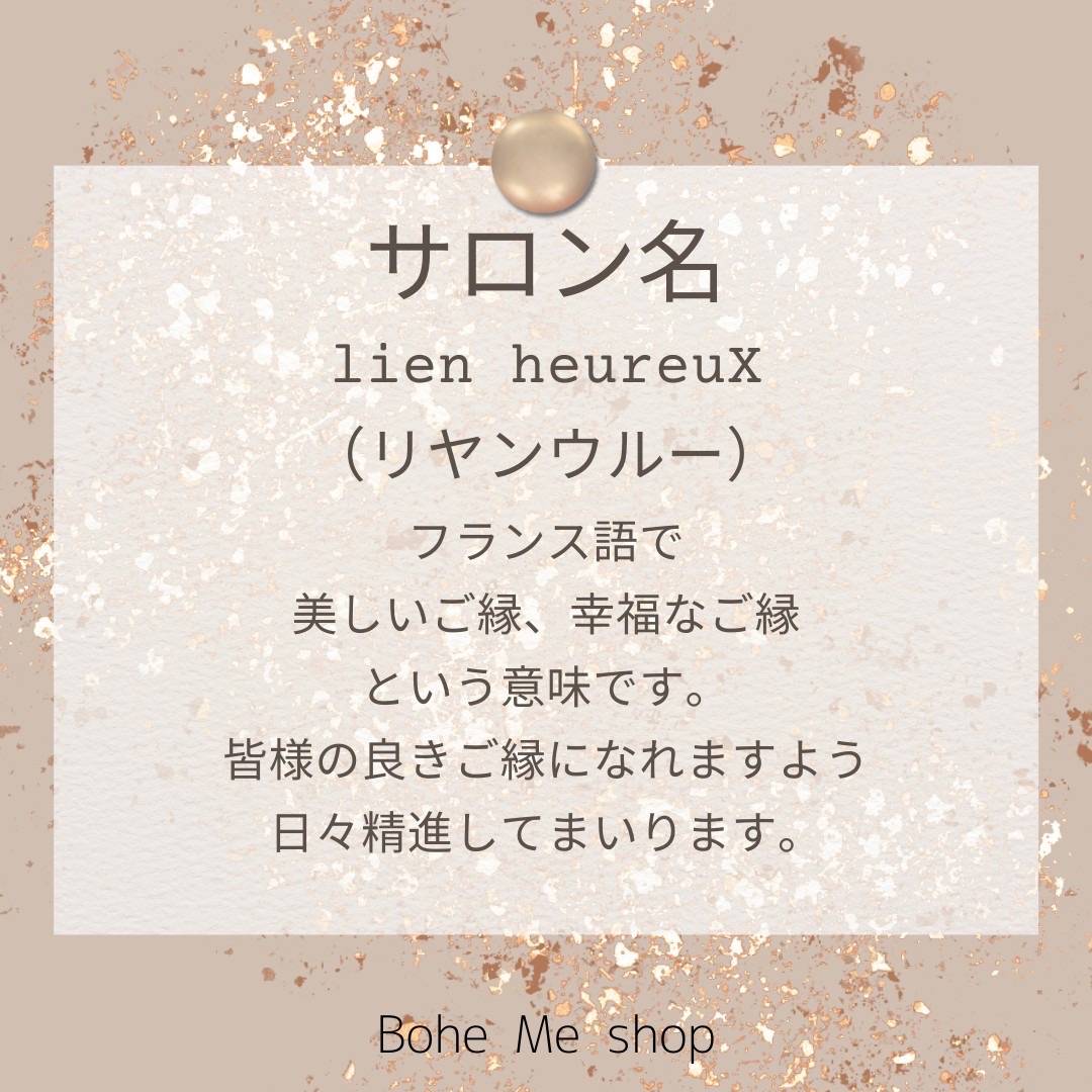 お店の名前が変わります【lien heureux】 2024/01/02 Bohe Me shop からlien heureuxへ 大変勝手ながら店名が変更になり、 今年度からサロン名のlien heureuxになります。 まだまだ、完璧に変更出来ていない部分もあり、 ご不便をおかけ致しますが宜しくお願いします🙇♀️ お知らせ♫