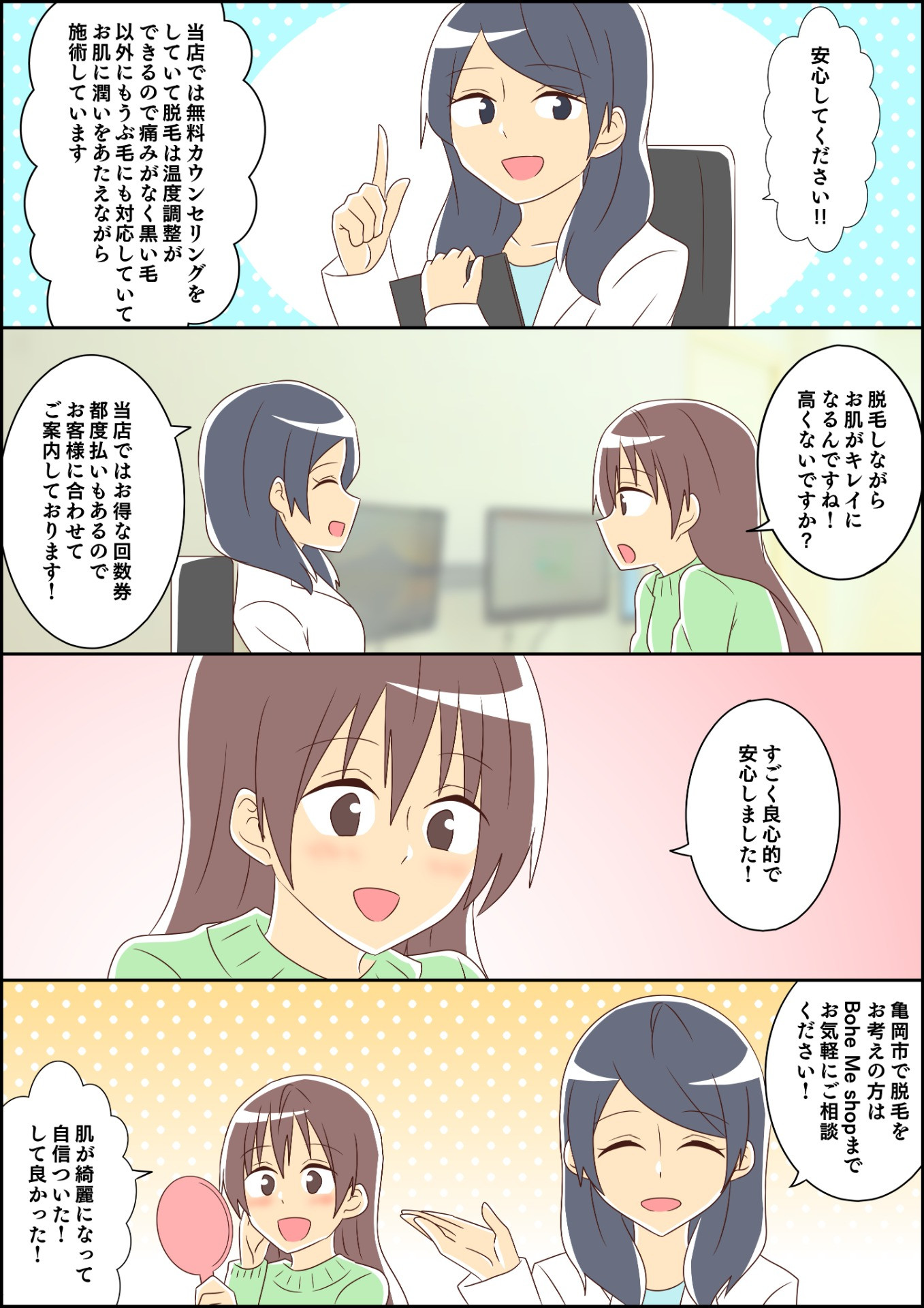 施術前には入念にカウンセリングを実施し、皆様に安心してご体験いただけるよう分かりやすく丁寧な説明を行っています。これからのご利用をお考えの方にも安心してご検討いただくため、施術に対する詳しいご説明やメリット・デメリットのご紹介などはブログにも掲載しており、効果が期待できる仕組みも分かりやすく記載しています。ビフォーアフター画像も施術回数とともに豊富に掲載し、スキンケア方法のご紹介も行っています。